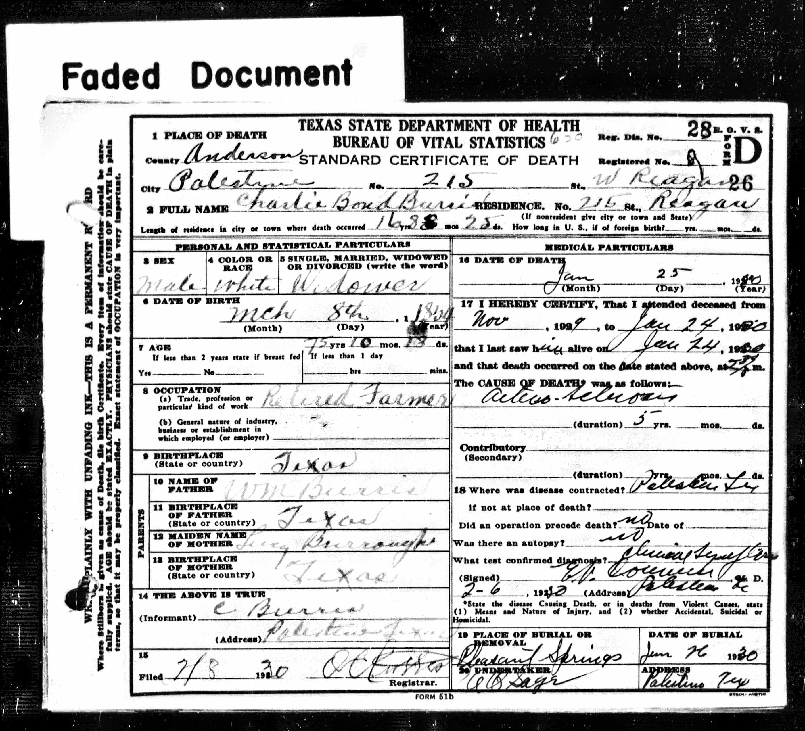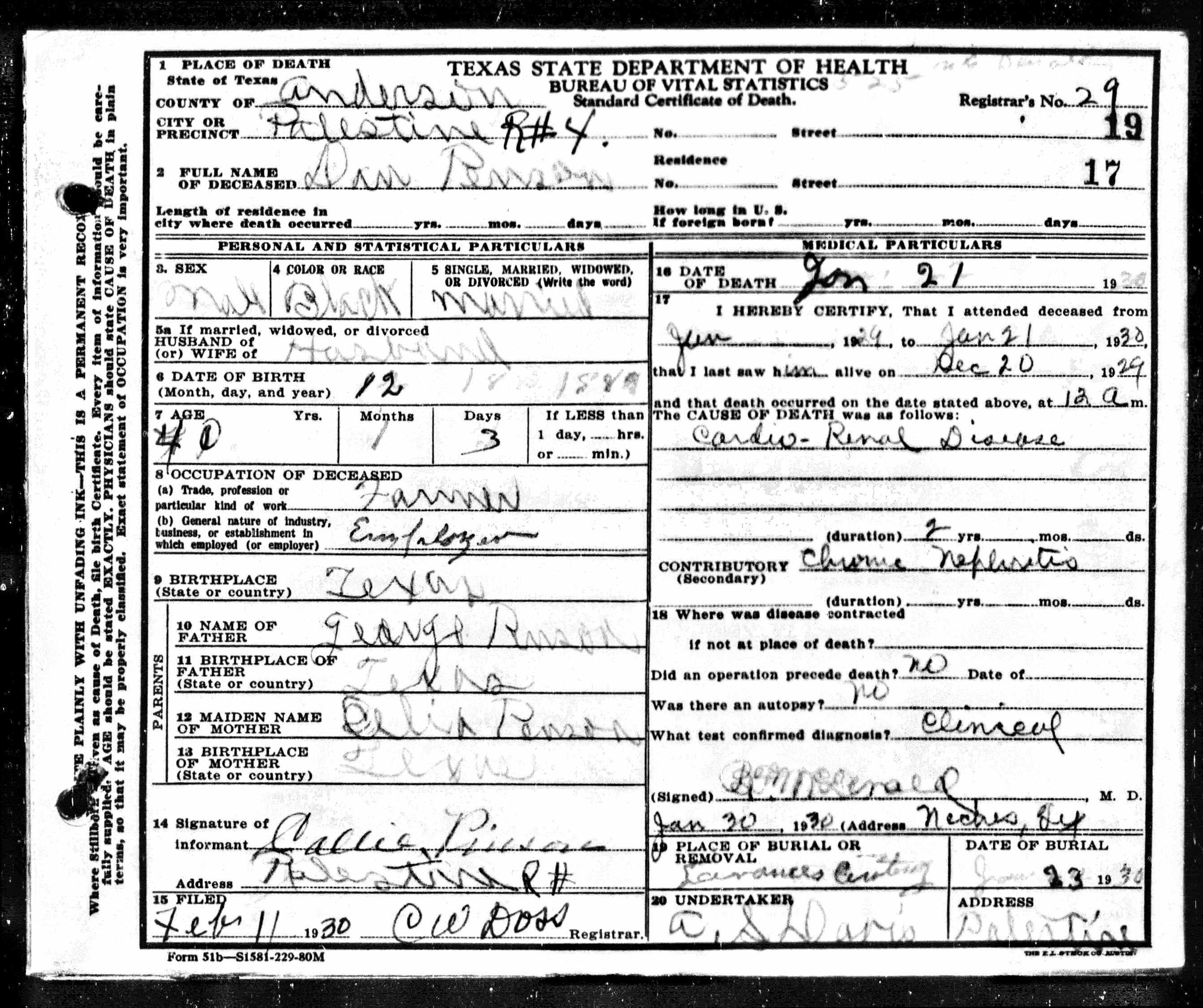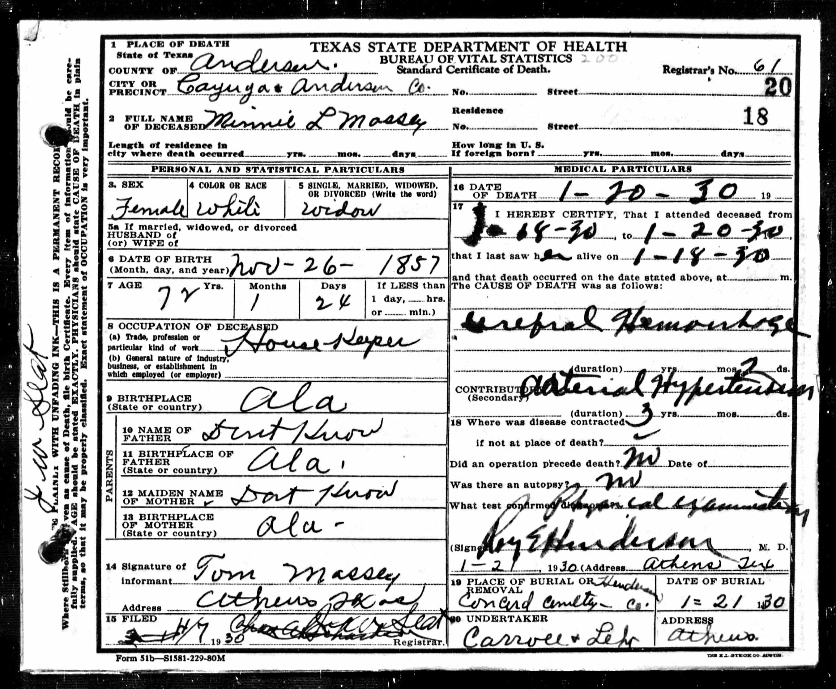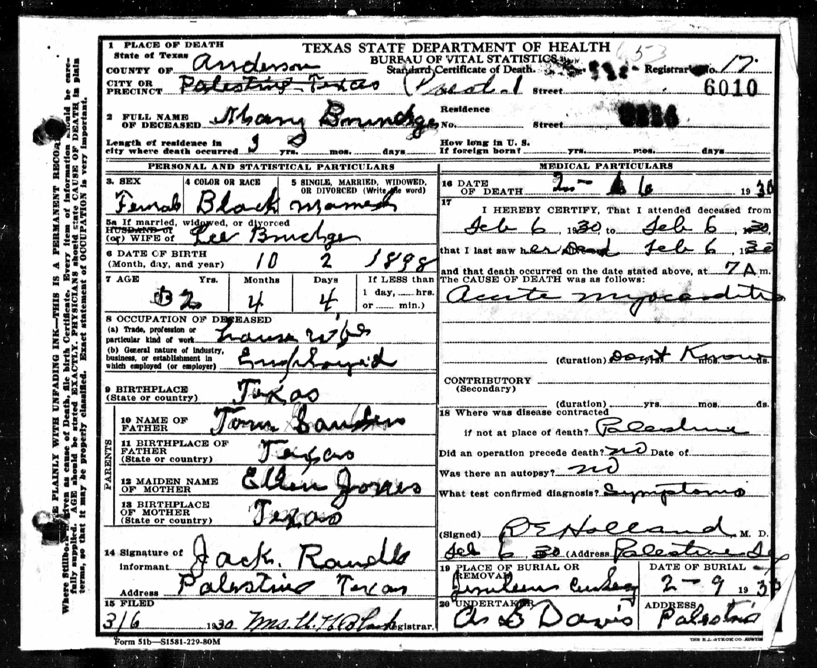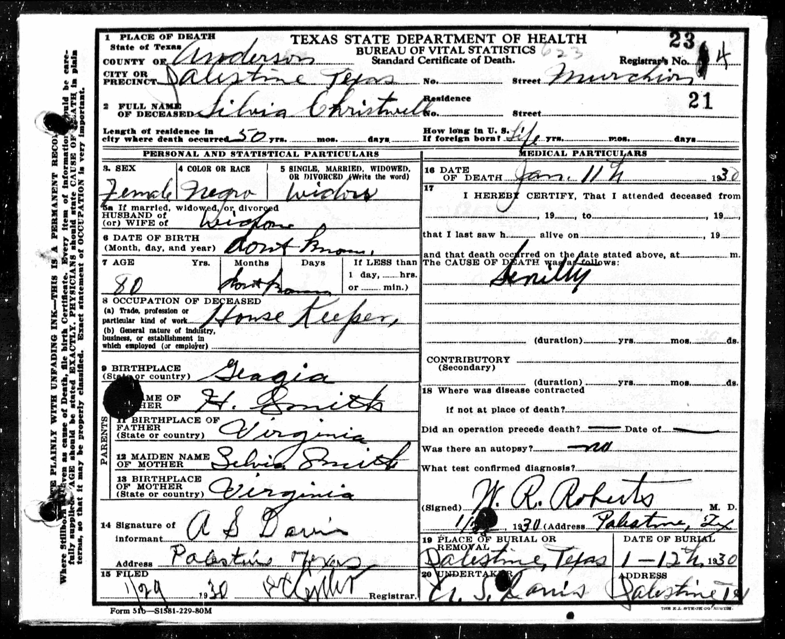 Death certificates for people born, married or died in Anderson County.