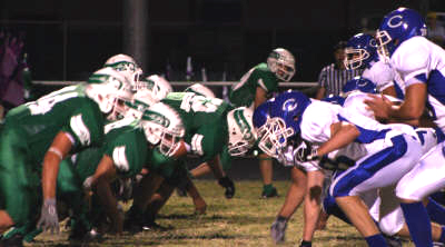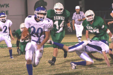By Jeff Wick October 14, 2006 WALL - For the better part of Friday night not much went right for the Wall Hawks football team. The five turnovers will go in that column. When they absolutely needed to, however, things went beautifully for the Hawks. About a quarter and a half after Wall kicker/running back/cornerback Aaron Smith booted possibly the ugliest extra point kick in West Texas this season, he recovered to nail the most beautiful field goal Wall fans had ever seen. Smith's 20-yard field goal with 8 seconds left in the game vaulted Wall to a 17-16 victory over Coleman in a gritty District 6-2A contest at Hawk Stadium. "I was so nervous," said Smith, who was sent out to try the game-winner in the midst of a late evening rain shower. "We had fought so hard to come back." The game-winner was set up by a late Wall drive in the final two minutes of the game that included a couple of crucial runs by Austin Scroggs and a pair of Matt Mills' passes to Smith and Bryce Ward. The completion to Ward was a 16-yarder that set up the Hawks (5-1, 2-0) at the Coleman four-yard line. That set the stage for Smith's kick (the first game winner of his life) which had so much distance it probably would have been good from 35 or 40 yards away. Coleman got the ball back with five seconds left and deep in its own territory, but it was too late. The loss was Coleman's first of the season. "The one thing about our kids is that they have great character," said Coleman head coach Rusty Buzzard, whose team falls to 5-1 overall and 1-1 in district. "They'll fight back and be ready to go next week." After trailing by 10 points heading into the fourth quarter, Wall owned the final 12 minutes of the game, scoring 11 unanswered points and limiting Coleman to zero first downs over that span. "It was tough the whole game," Buzzard said. "They just kept fighting back." Wall had just enough time to make the comeback mean something. "This was the kind of football game that if you paid your admission, you got your money's worth," said Wall head coach Kevin Burns, whose team heads into another huge game next week at state-ranked Early. Much of the night, Wall fans might have wanted a refund. The game was a defensive battle from the start, with both teams failing to find the end zone in the first quarter. Coleman finally broke the scoreless tie with 6:28 left in the second quarter when Colton Buzzard found Curtis Yates with a seven-yard touchdown pass. Kicker Oscar Villeda nailed the extra point and then he upped the Bluecats lead to 10-0 with a 30-yard field goal 1:54 before halftime. Those final few minutes before halftime were marred by several turnovers, especially for Wall. Three of the Hawks four possessions before halftime ended in turnovers - a pair of interceptions (by Coleman's Adam Vasquez and Chase Avants - and a Wall fumble. "We were just shooting ourselves in the foot," Burns said. Coleman had a late first half turnover of its own, Wall's Aaron Willman intercepted a Colton Buzzard pass, but the Bluecats defense didn't allow the Hawks to take advantage of it. In all, Coleman only allowed Wall 69 total yards of offense in that first half while the Bluecats had gained 142 yards before halftime. Early in the second half it was a gift from Coleman, a fumble deep in Hawks territory, that set up the first Wall score. Taylor Harrison caught a seven-yard Mills touchdown pass with 7:12 left in the third. Then came Smith's less spectacular kick of the night, an extra point try that barely got off the ground and squirted way left. Coleman responded quickly to the Wall touchdown, however, with a 26-yard touchdown pass from Colton Buzzard to Avants. That put the Bluecats up 16-6 but the ensuing extra point was blocked. No one knew at the time how important that block would be. Wall closed the gap to two points early in the fourth on a Zach McCormick seven-yard run and a Willman two-point conversion catch. McCormick finished with a game-high 90 yards rushing for Wall. The Hawks forced a Coleman punt and then marched 76 yards before fumbling going into the end zone for what would have been the go-ahead score on a fourth-and-one with just over three minutes to play. The Wall defense came up big again and gave the Hawks the ball back with 2:07 left.