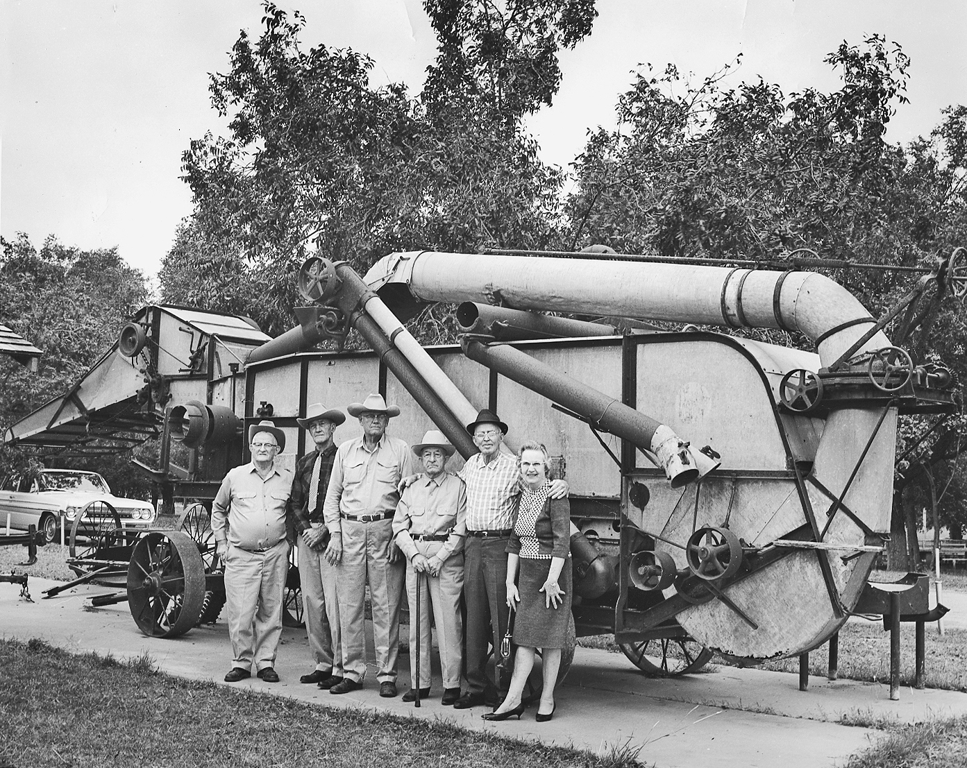 The Old Threshing Machine at the Coleman County Museum in the City Park brings back many memories to the group above who were directly involved with it many years ago. They are, from left, Edd Bedell, who worked on the thresher crew from 1914 through 1926; Oscar Hintner, who was separator man for Eric Tate and Ben Hintner, prior to 1926; Hubert Stokes, who contributed the thresher to the museum and operated it from 1927 through 1938;G.R. [Rube] Bouldin, who was partner with John Stokes with the threshing machine in 1926; Mr. and Mrs. Walter King who cooked for the thresher crew during the 1926 and 1927 seasons.