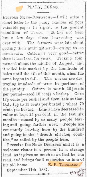 Blount County News-Dispatch Letter from E. P. Thompson painting a picture with words of the area surrounding Italy, Texas. |