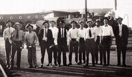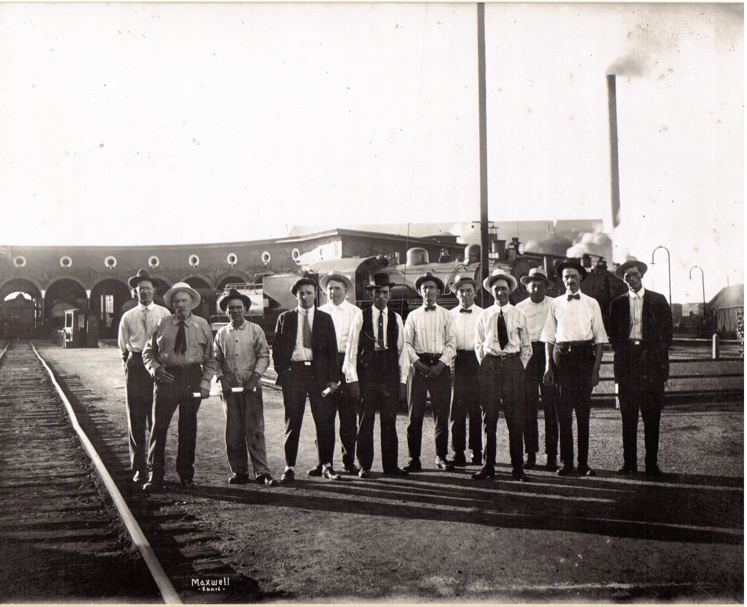 This picture, taken at the H. & T. C. Roundhouse in Ennis, includes my great grandfather, Stonewall Jackson Gathings. He is standing at the very right. The date of this photo is unknown.