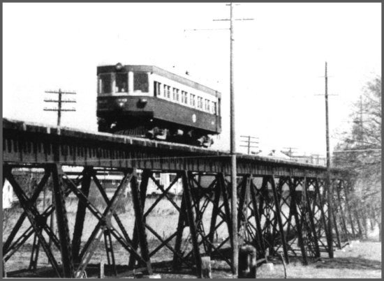 The passenger Interurban crosses the famous Waxahachie steel overpass over Waxahachie Creek and the steam railroad tracks. In the 1920's, Waxahachie Creek flooded the steam railroad tracks below the overpass. When they tried to run a train through the water, it put out the boiler fire. The Waxahachie Fire Department had to evacuate passengers by ladder up to the trestle.'' |