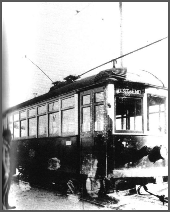 Waxahachie's electric streetcars, fed by 1200 volt overhead lines. "West End" was one of three local lines, the others being "East End" and "University." |