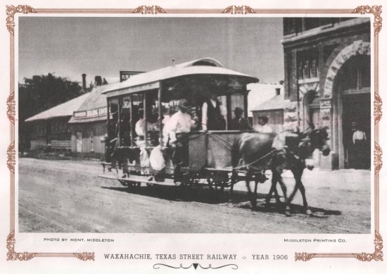 Waxahachie Mule Car on courthouse square, Main Street, between Rogers & College Streets, circa 1903. A bustling day in downtown Waxahachie. |