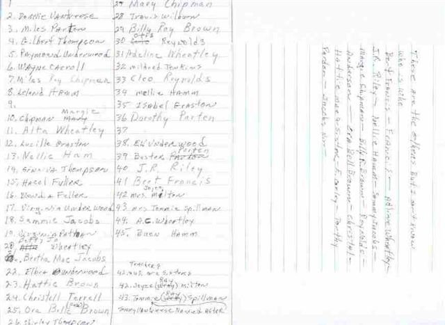 South Prong School - 1926-27 John Elbert Vantreese was on the School Board here. 1st Row L-R: ___________, Donnie Vantreese, Miles Parten, Gilbert Thompson, Raymond Underwood, Wayne Carroll, Miles Ray, Chipman, Leland Hamm. 2nd Row L-R: ___________, Margie Chipman, Margie Chipman, Alta Wheatley, Lucille Graston, Nellie Ham, G. Thompson, Hazel Fuller, Blondia Fuller, Benjamin Underwood, Virginia Patman, Betty Jo Wheatley. 3rd Row L-R Bertha Mac Jacobs, Elbra Underwood, Hattie Brown, Christell Terrell, Ora Billie Brown, Shirley Thompson, Mary Chipman, Travis Wilburn, Bille Ray Brown, Otis Reynolds. 4th Row L-R Adeline Wheatley, Mildred Jenkins, Cleo Reynolds, Mellie Hamm, Isabel Graston, Dorothy Parten. 5th Row L-R E. V. Underwood, Buster (Parten, J. R. Riley, Bert Francis; Mrs. Joyce Milton, Mrs. Tommy Spillman, A. C. Wheatley, Buen Hamm. Note: Joyce (Ray) Milton & Tommy (Ray) Spillman were sisters) |