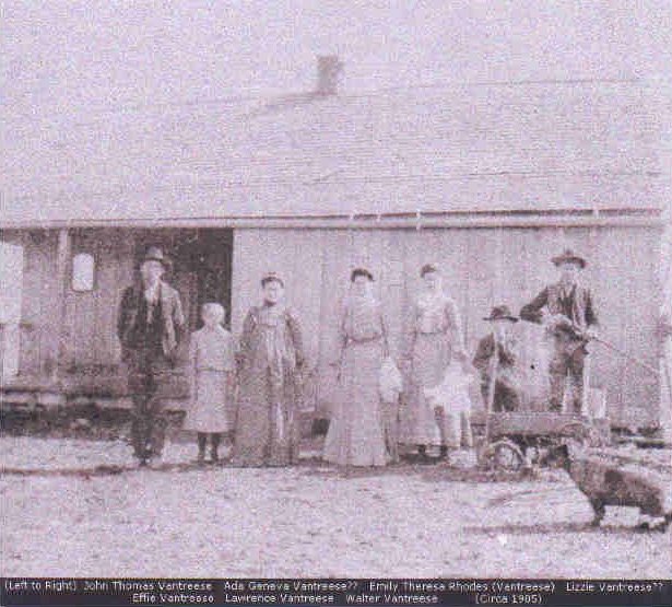 The School and Church shown on the map that Phillip Vantreese drew on the corner of what is now Chisholm Trail, New Haven Road and Farm to Market 55. Back in those days Chisholm Trail was then The Old Italy Road and Farm Road 55 was not there at the time. New Haven Road had a differant name too. The old store was about 1/4 mile south of the school on what is now Farm Market 55. The store was called Fletcher's Store. I also included a photo of the John Vantreese family the house was some where close to Fletcher's store. If you have any questions please contact me. I hope this helps. |