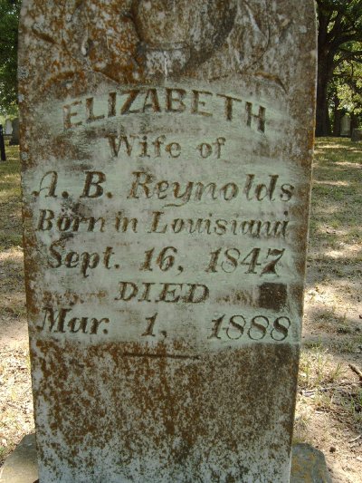 Elizabeth was daughter of George W. & Harriet Abercrombie Derden. She was a sister to my great-grandmother. Her 2nd husband, A.B. Reynolds, was a brother to my great-grandfather.