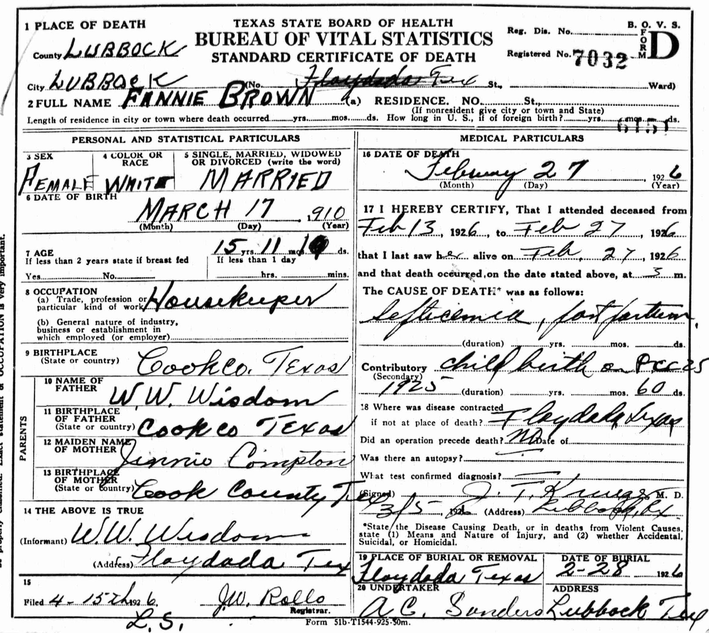 Fannie Dorinda Wisdom Brown, 15, passed away in Lubbock, Texas on February 27, 1926 from complications of childbirth. She was born March 17, 1910 in Cooke County, Texas to William Washington and Jennie Bell Compton Wisdom. She was buried in the Antelope Cemetery in Floydada, Texas. She is survived by her husband and a number of brothers, sisters, aunts, uncles and cousins. There is no marker.