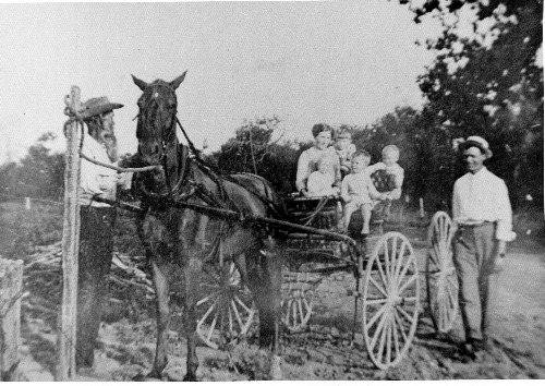 Standing on ground,left to right:Wm.Henry Harrison Barnard and his son George Barnard.Sitting in Buggy: Maggie Barnard,Billy, Sam and Twin sister Sallie. Fourth kid ?.