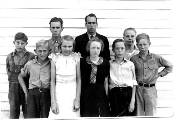 ca 1934-35 -Cuthand school kids and their teacher.front row-l-to r William Harvey Glover,Edina Franklin,Wilma Fae Bond,Eugene Bishop and Albert Jr. Bond--back row l to r Hershel Ely, Eugene Preston,John Terry (Teacher) and Robert Biship.