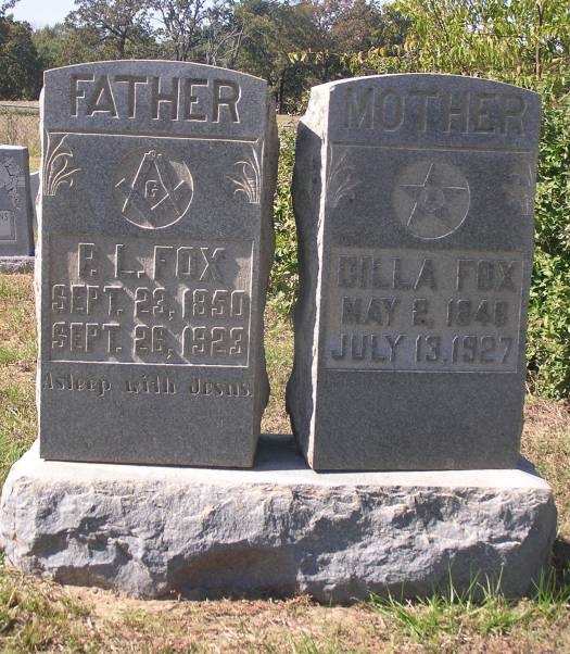 Fox P L 9-23-1850 9-26-1923 H/o Dilla Fox; Mason; Father