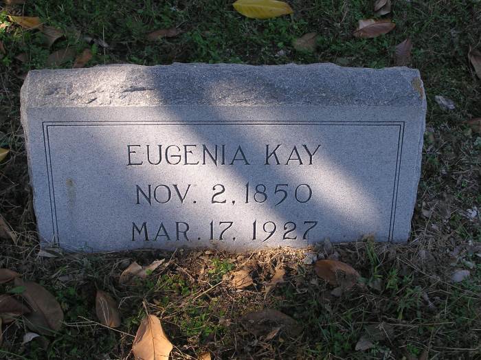 Kay Eugena - 11-2-1850 3-17-1927 Per Ronald Wade - Nancy Eugenia Drake Kay, born in Anderson, SC, the daughter of James Drake born about 1818 and Malinda Jane Emerson (1822 ? 1915).  She married 30 Sep 1875 in Anderson, SC to Newton Calvin Kay (1845-1929) and their children included Anna Kay (1876 ? 1949), Samuel D. Kay (1878 ? 1896), Calvin Earl Kay (1881 ? 1952), Carl Cecil Kay (1883 ? 1946), John Roy Kay (1886 ? 1899), Mary Lois Kay (1888 ? 1969), Lucy Pearl Kay (1891 ? 1971), and James Bryan Kay (1896 ? 1981).