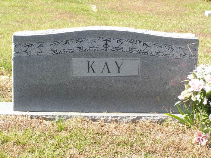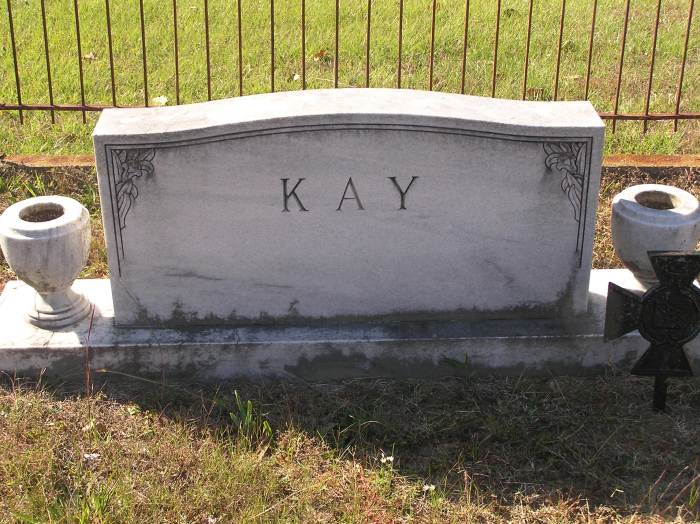 Kay Mary Susana 11-14-1856 7-15-1947 Family Marker;   Family Plotsee death certificate   Per Ronald Wade - Mary Susana Kilpatrick, born in Troy, Alabama,   She married Stephen Preston Kay (1840 ? 1926) on 18 Jan 1875 in Upshur Co., Texas.  Their children included Lawrence Melvin Kay (1877 ? 1951), Paralee Kay (1879 ? 1913), Albert D Kay (1880 ? 1963), Lee Roy Kay (1883 ? 1955), Laura Kay (1884 ? 1974), Wiley Preston Kay (1885 ? 1969), Archie Graves Kay (1888 ? 1971), Ivey Sue Kay born about 1890, Myrtle Kay born about 1892, Floyd Kay (1893 ? 1899), and Herbert Kay (1897 ? 1983).