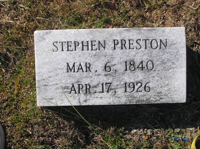 Stephen Preston 3-6-1840 4-17-1926 Family Marker;   Family Plot  Photo taken the day he left for the Civil War   Per Ronald Wade - Stephen Preston Kay, born in Alabama,   He married Mary Susana Kilpatrick (1856 ? 1947) on 18 Jan 1875 in Upshur Co., Texas.  Their children included Lawrence Melvin Kay (1877 ? 1951), Paralee Kay (1879 ? 1913), Albert D Kay (1880 ? 1963), Lee Roy Kay (1883 ? 1955), Laura Kay (1884 ? 1974), Wiley Preston Kay (1885 ? 1969), Archie Graves Kay (1888 ? 1971), Ivey Sue Kay born about 1890, Myrtle Kay born about 1892, Floyd Kay (1893 ? 1899), and Herbert Kay (1897 ? 1983). During the Civil War he enlisted 6 May 1862 in Co. G, 11th Texas Infantry, Robert's Regiment, Walker's Division.  He was paroled as a POW in Shreveport, La. between Aug 1 and 31, 1865.