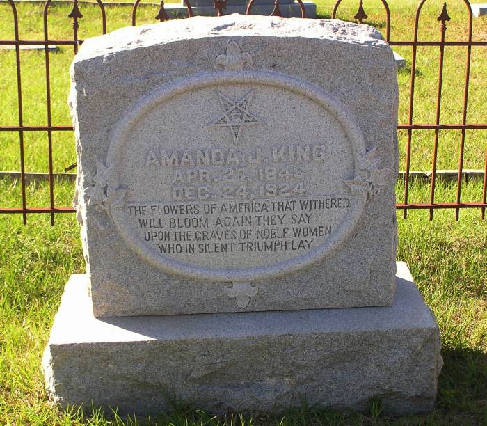 King Amanda J 4-27-1848 12-24-1924 Per Ronald Wade - Amanda Jane Lowry, born in Walker Co., Ga., the daughter of Mark "Sam" Lowry (1821 ? 1897) and Elizabeth B. Murdock (1824 ? 1862) married 23 Mar 1871 in Smith Co., Tx. to John Washington King and their children included John Thomas King (1872 ? 1926), James W. King (1873 ? 1880), Florence Gertrude King (1875 ? 1953), and Flora Belle King (1876 ? 1923).