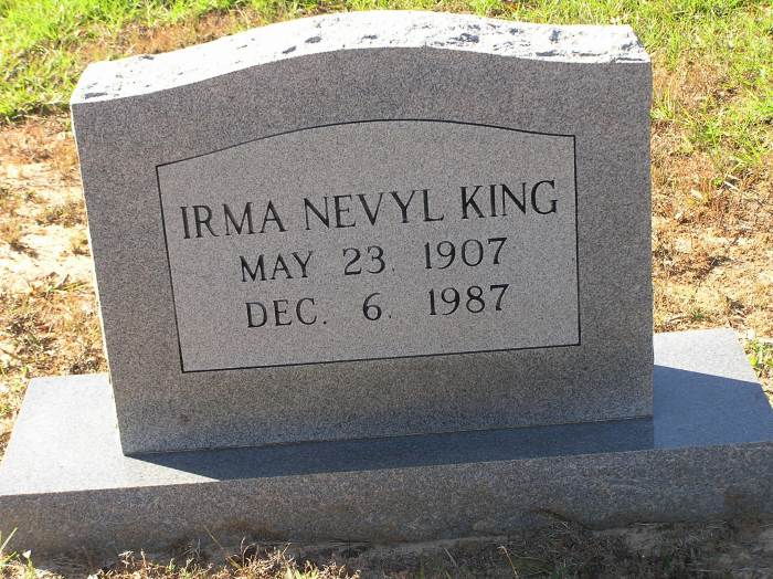 King Irma Nevyl 5-23-1907 12-6-1987 Daughter of John Thomas King Sr. (1872-1926) and Cairo "Kate" V. Beck King (1884-1976).