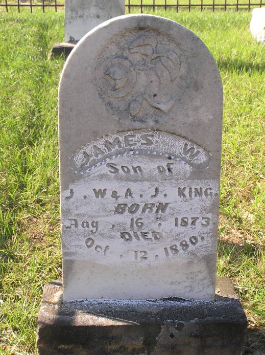 King James W 8-16-1873 10-12-1880 Per Ronald Wade - James W. King, infant son of John Washington King (1834-1879) and Amanda Jane Lowry (1848-1924).