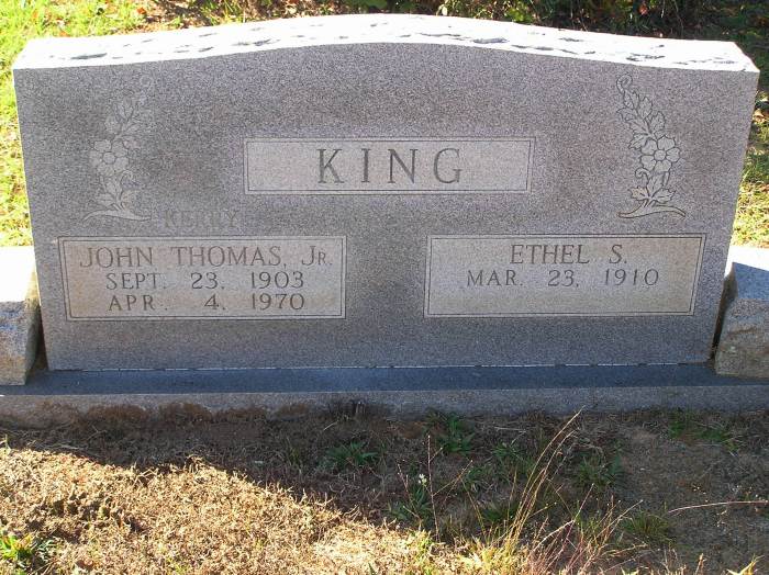 King  John Thomas Jr 9-23-1903 4-4-1970 DS with Ethel S    Per Ronald Wade - John Thomas King Jr., Born in Big Sandy, Upshur Co., Tx. the son of John Thomas King Sr. (1872-1926) and Cairo "Kate" V. Beck King (1884-1976).  Married Willie Ethyl Sullivan (born 1910) and their children included Ann Kerryn King (born about 1945), Donald King (1937-1938).  He died in Orange Co., Texas.