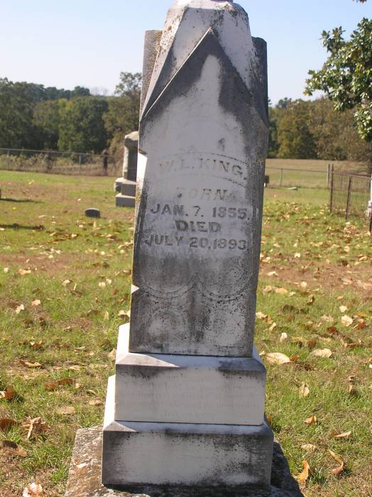 King, John Washington John Washington 10-13-1834 5-16-1879 Per Ronald Wade -  John Washington King born in Troy, Pike Co., Ala., the son of Thomas King (born 28 Sep 1800) and Dorcas Corbett (born 06 Nob 1805 in NC). He married 23 Mar 1871 in Smith Co., Tx. to Amanda Jane Lowry (1848 ? 1924).  Their children included John Thomas King (1872 ? 1926), James W. King (1873 ? 1880), Florence Gertrude King (1875 ? 1953), and Flora Belle King (1876 ? 1923).  During the Civil War he enlisted May 2 1862 in Upshur Co., Texas in Capt. M.V. Smith's Cavalry Company D, Col. Horace Randal's 28th Regiment.  He was first stationed in Marshall, Texas and later in Lewisville, Ark. serving through 1865.