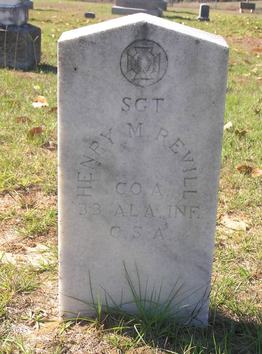 Henry M Feb 2 1842  Apr 9 1917 Photo   Sgt Co A Ala Inf CSA Per Ronald Wade - Henry Martin Revill, born in Darlington, SC, the son of Joseph John Revill (1809 ? 1870) and Martha White (1808 ? 1865).  On 16 Dec 1875 in Fincastle, Tx. he married Sarah Ella Parmer (1856 ? 1942).  Their children included Mary Ella Revill born about 1867, William Monroe Revill born about 1869, Elizabeth Revill born about 1877, Thredonia Revill born 1879, Hattie Revill (1881 ? 1967), James Ezra Buddy Revill (1884 ? 1959), Henry Joseph Revill born about 1888, Aron Revill born about 1890, and Hubert Revill (1895 - 1980).   During the Civil War he enlisted in 1861 in Co. A., 12th Alabama Regiment under Capt. Kinney & Col. Adams & 32nd Alabama Regiment.  He was discharged in 1864 due to a wound received in battle.