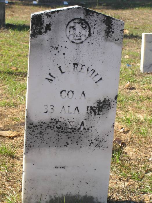 Revill M L 7-3-1845 12-21-1900 Co A Ala Inf CSA  Per Ronald Wade - Madison "Matt" Lafayette Revill, born in Darlington, SC,  the son of Joseph John Revill (1809 ? 1870) and Martha White (1808 ? 1865).  In 1870 in Ala. he married Martha J. Revill (1851-1931) and their children included Alfred Revill (born about 1882), Leroy Revill (born about 1885), Elias Revill (born about 1888), Minnie L. Revill (born about 1890), Charles Revill (born about 1891), and Elva Revill (born about 1894).  During the Civil War he enlisted in Co. A, 33rd Alabama Infantry, CSA from 1863 to 1865 and was wounded in action.