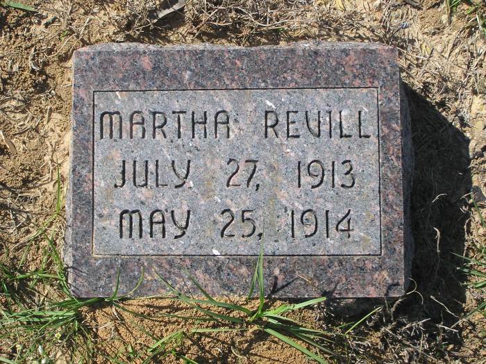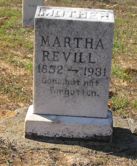 Revill Martha - 1852 1931 Mother; Gone But Not forgotten  Per Ronald Wade - Martha J. Revill, born in Ala. she married in Ala. in 1870 to Madison "Matt" Lafayette Revill (1845-1900) and their children included Alfred Revill (born about 1882), Leroy Revill (born about 1885), Elias Revill (born about 1888), Minnie L. Revill (born about 1890), Charles Revill (born about 1891), and Elva Revill (born about 1894).