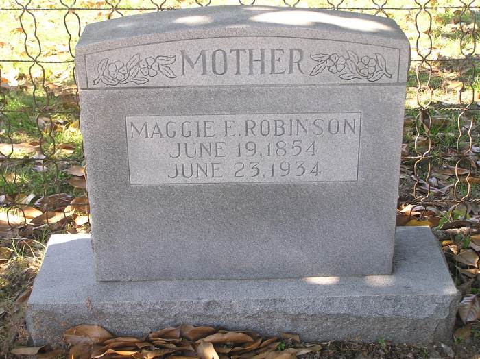 Robinson Maggie E 6-19-1854 6-23-1934 Family Plot  Per Ronald Wade - Maggie E. Robinson, born in Wayne Co., Tn., she married 31 Dec 1877 in Hardin, Tenn. to James Knox Polk Robinson (1844-1914) and their children included Fannie R. Robinson born about 1869, W. H. Robinson born about 1871, Delilah Robinson born about 1873, John Robinson born about 1876, Robert Robinson born about 1878, Dorsey Robinson born about 1879, Nellie I. Robinson born about 1883, Minnie Robinson born about 1888, Eddie Robinson born about 1891, and Mary Robinson born about 1895.
