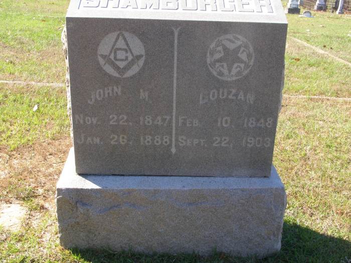 John M 11-22-1847 1-26-1888 DS with Louzan - Photo   Per Ronald Wade - John Marion W. Shamburger, born in Moore, NC, the son of Matthew Shamburger (1813 ? 1899) and Elizabeth Brown (1818 ? 1901).  In 1873 in Upshur Co., Tx. he married Louzan Frances Sligh (1848-1903).  Their children included John Shamburger, Archie B. Shamburger (1877-1882), Clopton Dooly Shamburger (1878 ? 1955),  Frances "Fannie" Elizabeth Shamburger (1881 ? 1964 married Elbert J. Gee), and Johanna Shamburger born about 1888.  During the Civil War he enlisted in Co. B, 10th Regiment, Texas Cavalry (Locke's) CSA.