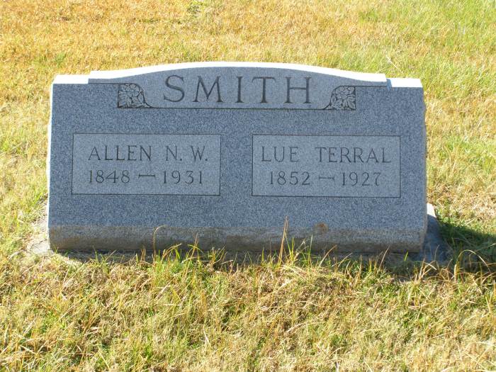 Smith Allen N W 3-13-1848 7-2-1931 Per Ronald Wade - Allen Newton Waddell Smith, born in Laurel, Miss., the son of Maggie Ferguson.  He married in 1878 in Quitman, Clarke Co., Miss. to Harriet Lucretia "Lou" Terral (1852-1927) and their children included Leonidus Smith born 1879, Cecil H. Smith born about 1881, Allene T. Smith born about 1889.  He was a School Superintendent.  On 7 Apr 1862 at age 14 he enlisted in the Confederate Army saying he was 18. He enlisted in Capt. Thomas Bonner's 10th Texas Brigade in Cherokee County and served until the war's end in 1865.