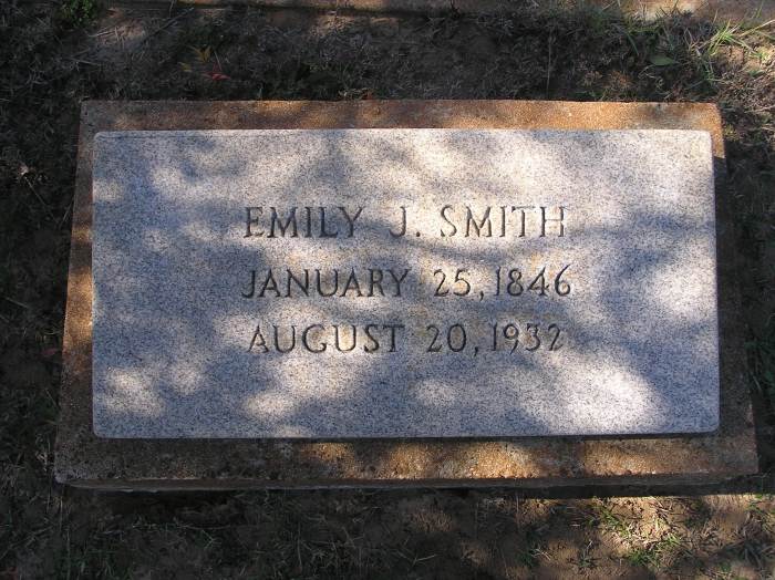 Smith Emily J 1-25-1846 8-20-1932 Per Ronald Wade - Emily J. Smith, born in Ark., she married in Ark. in 1863 to Beverly Lafayette Smith (died 1916 Big Sandy, Upshur Co., Texas) and they had five children only one of which was living by the 1900 Federal Census, Lucy M. Smith (1877-1954 Upshur Co., Tx. who was Lucy Smith Mack (Mrs. Clyde I. Mack) living in Big Sandy, Tx. in 1941.