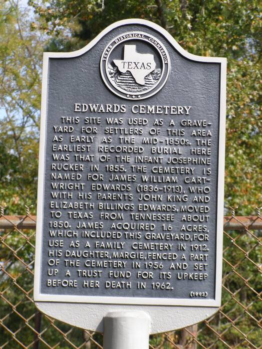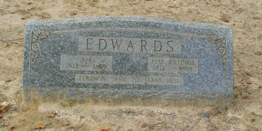 Edwards, J K 1813 1869 DS with Elizabeth Billings      Per Ronald Wade -John King Edwards, born in Wilson Co., Tenn., the son of James Edwards (1773 ? 1850) and Elizabeth J. "Patsey" Cartwright (1784 ? 1818).  Married 8 Nov 1834 in Wilson Co., Tenn. to Elizaeth H. Billings (1812 ? 1899).  Their children included future Confederate Soldier James William Cartwright Edwards (1836 ? 1913), Ellen M. Edwards (1838 ? 1866, married Capt. James Howard Rucker 1821 ? 1888), future Confederate Soldier Paulden H. Edwards (1841-1862 buried here), Nancy Angeline Edwards (1843 ? 1872, in 1866 after her sister Ellen's death married brother in law Capt. James Howard Rucker), Elisabeth S. Edwards (1848-1877, married Roland Maddison Duncan 1846 ? 1874), Alletha Pruedella Edwards (1855 ? 1943), and Pricilla Edwards born about 1855.  During the Civil War he was a Private, Confederate Army, 10th Texas Cavalry, Co. C., (Locke's), enlisted 1861 in Upshur Co., Texas.