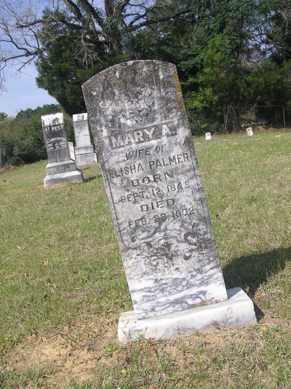 PALMER, Mary A. Sep 12, 1848 Feb 28, 1902  Per Ronald Wade - Mary Adaline Little Palmer, born in Miss., she married the Rev. Elisha Palmer (1848-1917) and their children included Mary Palmer (born about 1869), J. C. Palmer born about 1871, W. L. Palmer born about 1873, Henry C. Palmer born about 1875, a daughter, A. Palmer born about 1877, E. C. Palmer born about 1880, T. L. Palmer born about 1886, Nellie Palmer born about 1889, Margaret Palmer born about 1891.
