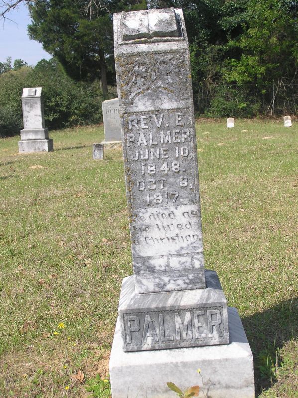 PALMER, Rev. E Jun 10, 1848 Oct  8, 1917 Per Ronald Wade - The Rev. Elisha Palmer, born in Cobb Co., Ga., the son of John Palmer (1808 ? 1884) and Mary Ann Camp (born about 1829).  He married 26 Sep 1867 in Toshomingo, Alcorn Co., Miss. to Mary Adaline Little (1848 ? 1902)and their children included Mary Palmer (born about 1869), J. C. Palmer born about 1871, W. L. Palmer born about 1873, Henry C. Palmer born about 1875, a daughter, A. Palmer born about 1877, E. C. Palmer born about 1880, T. L. Palmer born about 1886, Nellie Palmer born about 1889, Margaret Palmer born about 1891. Later he married Silvia Savannah "Vannie" Bland (4 Feb 1855 - 3 Nov 1936 widow of David A. Culpepper) at Upshur Co., Texas, on 14 Jan 1906.  Silvia is buried Old East Mountain Cemetery, Upshur Co., Tx.
