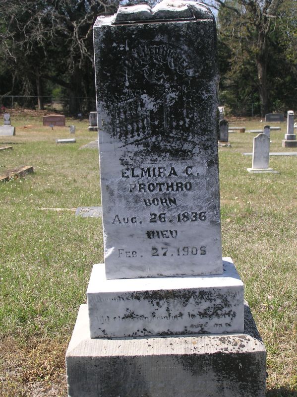 PROTHRO, Elmira C. Aug 25, 1836 Feb 27, 1905   Per Ronald Wade - Elmira C. Holloway Prothro, born in Georgia, she married M. P. Prothro (born about 1826 SC) and their children included Almeda Anna Prothro born about 1858, Stella E. Prothro born about 1862 and Dirten Prothro born about 1875.  Her husband owned a Saw Mill in Harrison Co., Tx.