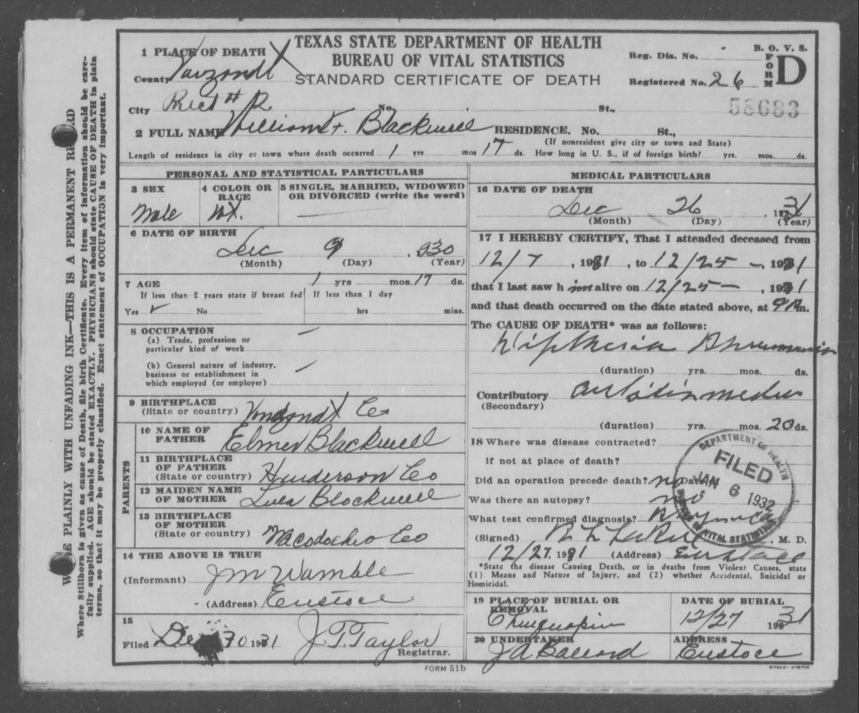 09, 1930-----Died Dec. 26, 1931
