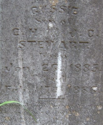Gussie was the one year old son of Cortutian H. and Julia Stewart. His siblings were: Sisters: Mariah E., Mary, Frances, Maybell, Della, and Pearlie. Brothers: William, and Charles. Several of them born years after his death. You can learn more of his family on the pages for Julia C. Stewart and Sallie E. Stewart. (Research by Betty Phillips using the Van Zandt County US census, Jones Cemetery and the VZC Marriage Records Book 1848 - 1909)