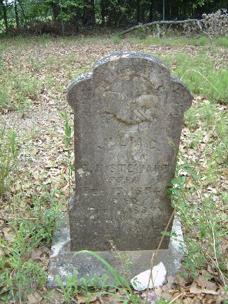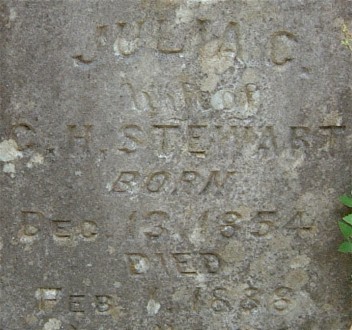 In the Van Zandt county 1880 census, Julia was living with her husband, Cortutian H. Stewart, who was a farmer, and their two little girls, Frances, age 2 and Mary, age 1. They had lost another daughter in 1878, Mariah, who would have been 3 years old in 1880, and a son, Gussie, who died in 1886. Mariah and Gussie were both just 1 year old when they died. They are buried near Julia. C. H. & Julia had 3 more children after 1880, who lived. A son, William was born in 1883, a daughter, Maybell was born in 1886, and a daughter, Della C. was born in Jan. 1888. Julia died soon after the birth of Della. All of the children attended school and could read & write. Son, William, a farm worker, only attended school 3 years, but could read & write. Julia was born in Texas and both her parents were born in Alabama. Julia was the first wife of C. H. Stewart. He later married twice more, in 1889 and again in 1903, each of the two women had been widows. His second wife, Sallie E., is buried near Julie. By the 1910 census, C. H. and son Charlie were living in the home of his daughter, Frances Stewart Grammer and her husband, W. I., and their children. (Research by Betty Phillips using the Van Zandt County US census, Jones Cemetery and the VZC Marriage Records Book 1848 - 1909)