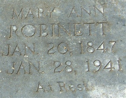 Mary Ann was the wife of Michael Mack "Mike" Robinett. Acording to the 1880 Van Zandt County, Texas, Census, Mary Ann was living with her husband M. M. Robinett, and had the following children: John, age 12, in school; Mittie, age 8, in school; Dee, age 5 , in school; and Mary age 2. Mary Ann's father was born in Georgia and her mother in Alabama. (I remember her son Dee. He was an old man when I was a child and we called him "Mr. Dee".)