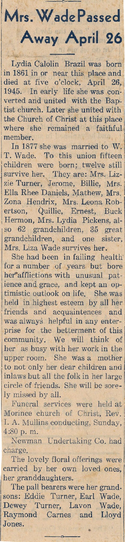 Wade; Quillie Wade; William Tinsley Wade; Leona Wade; Lydia Caroline