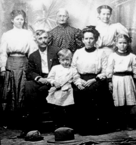 The family of John Henry McGhee and Tennie Maye Cathey McGhee taken in Wood Co. in 1908 or 1909. Front row l. to r. John Henry; son, Clarence Newton; wife, Tennie Maye; daughter, Winnie Jane. Back row l. to r. Nellie May (Kirkland); Mary Elvira Banks, Widow of Newton John McGhee; Vallie Ree (Usury). Nellie and Vallie are John Henry's daughters from his first wife, Martha "Mattie" Rape. Photo courtesy Gary McGhee.